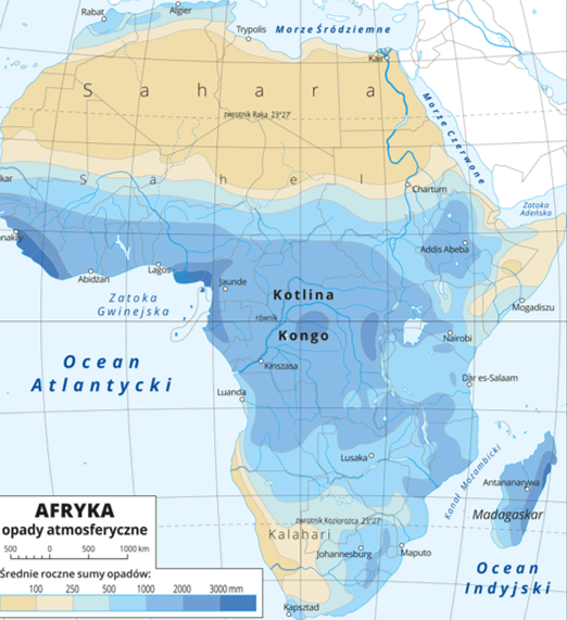 A to mapa opadów. Wyraźnie widać na niej znaczące różnice. W obszarach zaznaczonych na mapie kolorem ciemno niebieskim pada bardzo dużo, kilka razy więcej niż w Polsce, natomiast tam gdzie widzimy kolor beżowy nie pada prawie wcale.