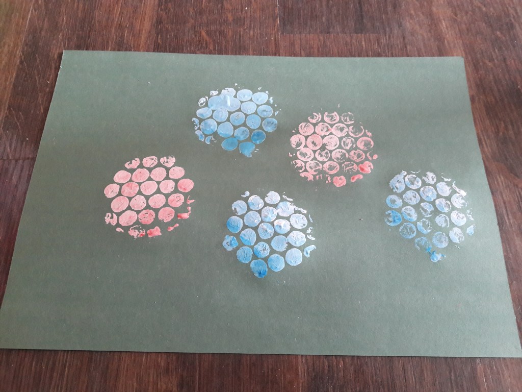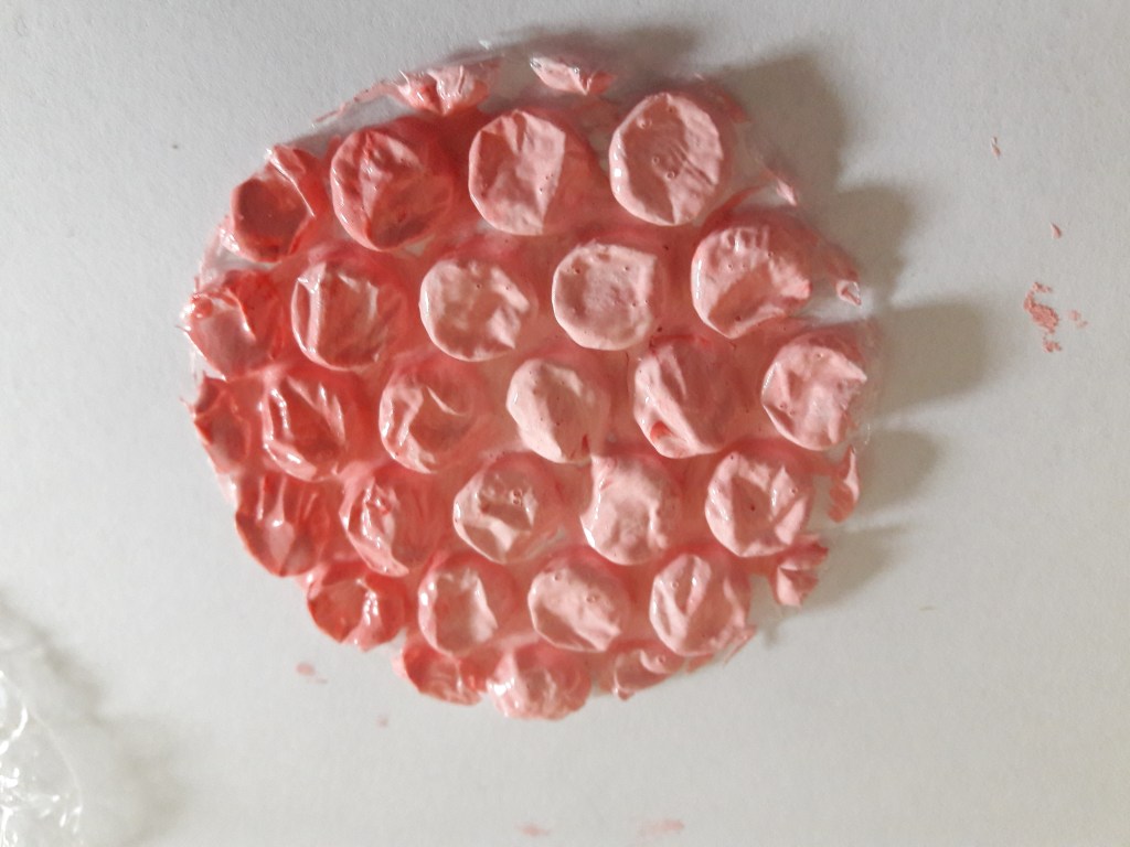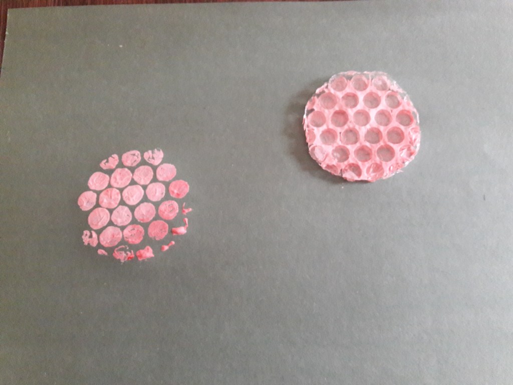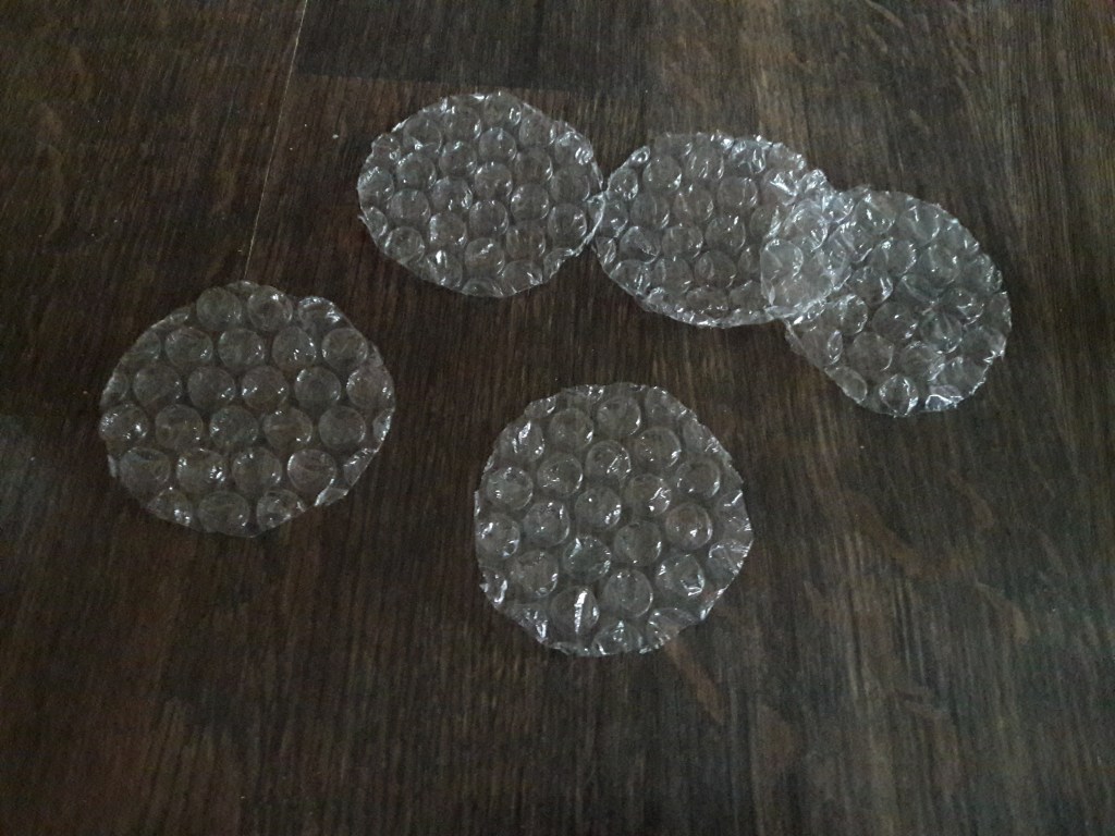 Z folii bąbelkowej wycinamy kółeczka i malujemy je farbą (po wypukłej stronie)