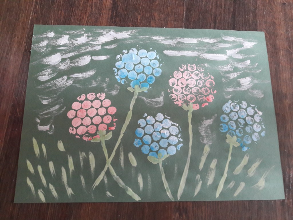 Domalowujemy pędzelkiem łodyżki, trawę i niebo