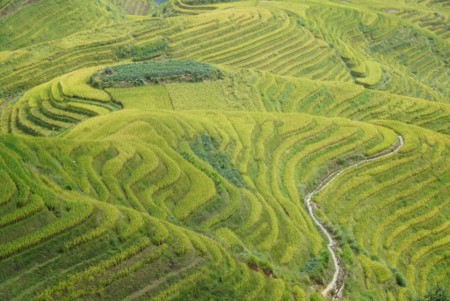 Tarasy ryżowe czyli podmokłe pola na których uprawia się ryż można spotkać w Chinach w wielu miejscach ale najbardziej znane są Tarasy Smoczego Grzbietu w pobliżu miejscowości Loghsheng
