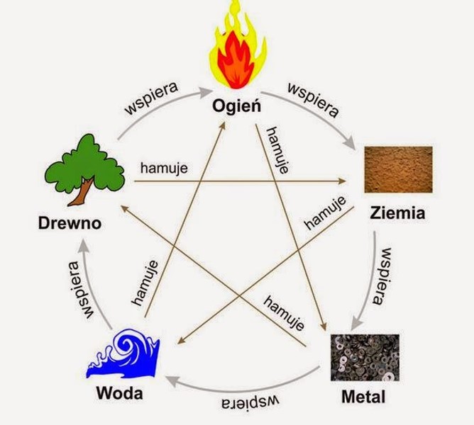 Zgadza się że trochę tego dużo ale zna to na pamięć każde chińskie dziecko. Na pięciu elementach opiera się w chińskiej tradycji wszystko od medycyny przez urządzanie domu aż po kuchnię. Jeśli na przykład komuś brakuje radości która związana jest z żywiołem ognia to powinien postarać się o coś związanego z drzewem które wspiera ogień. Może częściej chodzić do lasu, lub nosić przy sobie jakiś drewniany amulet albo ubierać się na zielono. A może je za dużo słonych rzeczy, bo smak słony związany jest z wodą która gasi ogień.