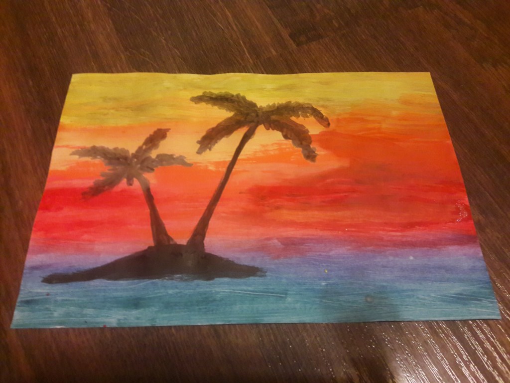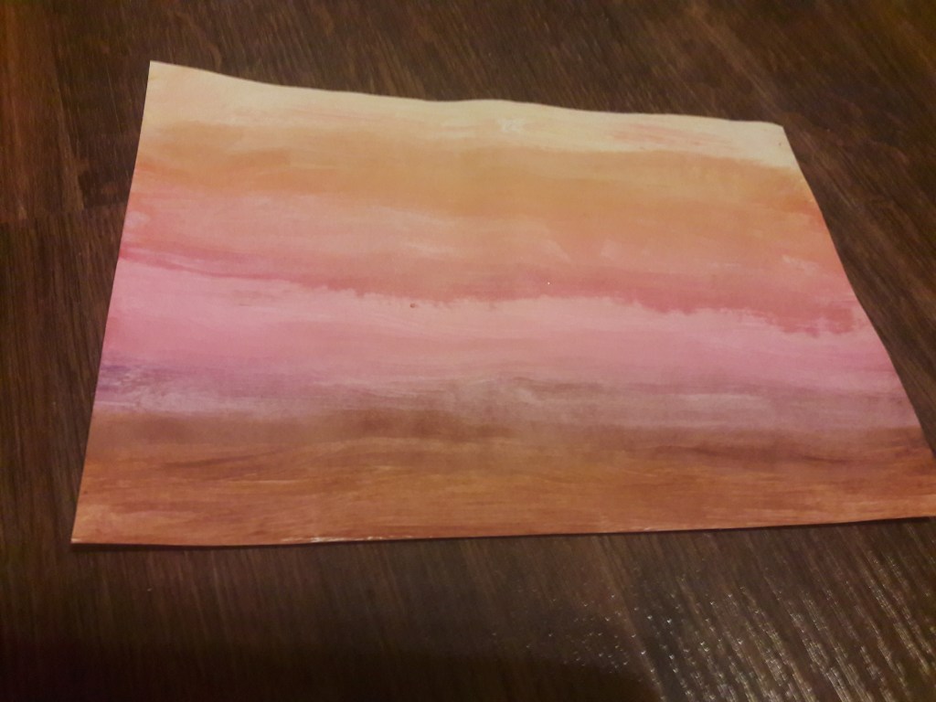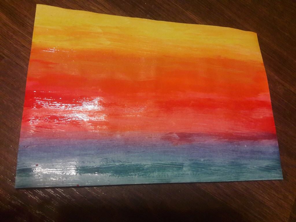 Ważny jest dobór kolorów tak, aby każdy kolor płynnie przechodził w drugi (np. pomarańczowy pomiędzy żółtym i czerwonym, fioletowy pomiędzy czerwonym i niebieskim) Nie mieszamy ze sobą jasnych i ciemnych kolorów ale przechodzimy stopniowo od ciemniejszych do jaśniejszych lub odwrotnie. Po namalowaniu pasków zostawiamy obrazek do wyschnięcia