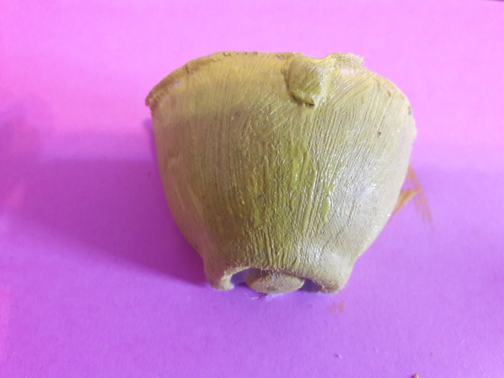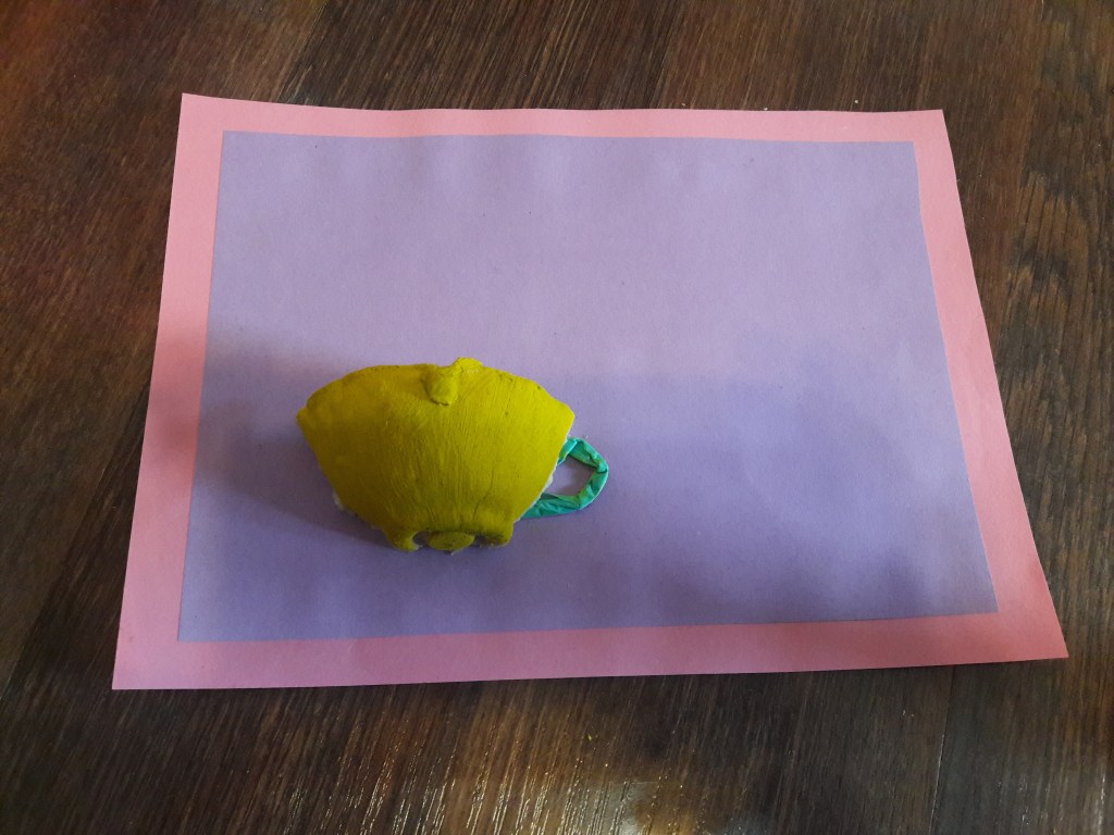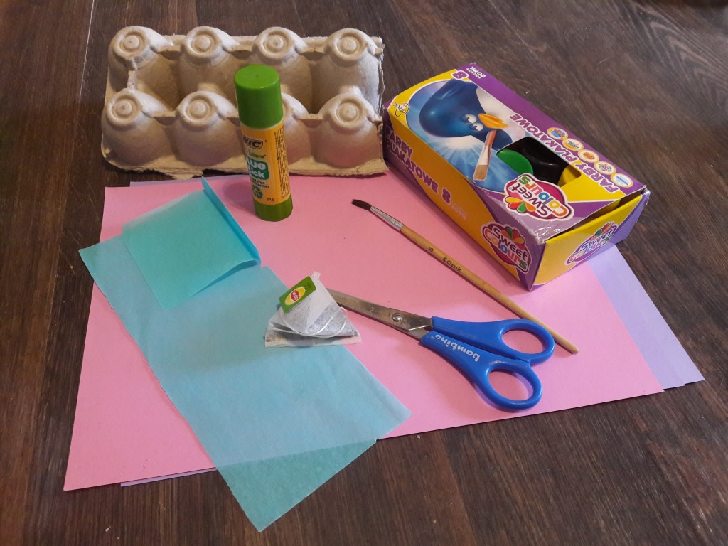 Jedną przegródkę wytłaczanki przecinamy na pół i malujemy farbą (wystarczy tylko po wypukłej stronie). Pozostawiamy do wyschnięcia.