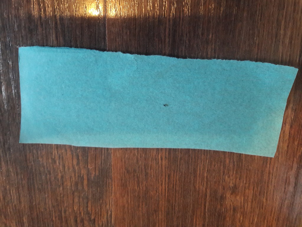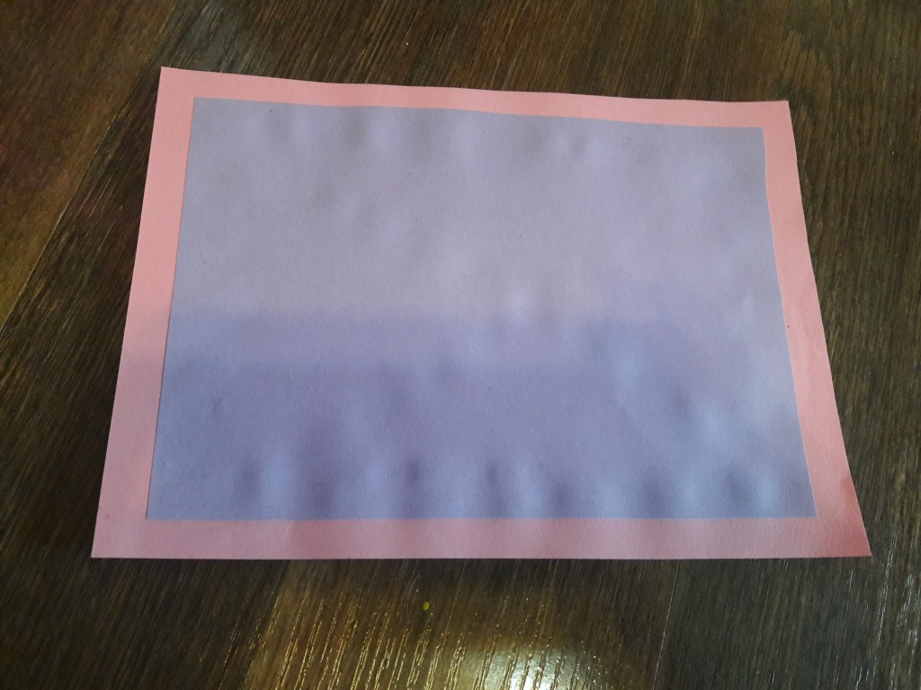 Dwie kartki o różnych kolorach przecinamy na pół. Połówkę jednej kartki przycinamy aby ją zmniejszyć i naklejamy na połówce drugiej
