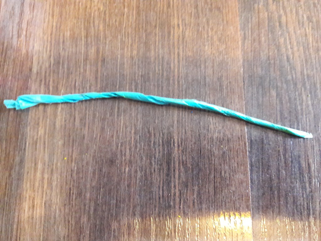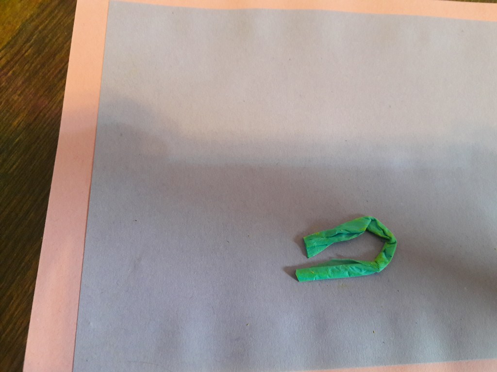 Kawałek bibuły zwijamy w sznureczek i formujemy z niego ucho filiżanki. Przyklejamy ucho na kartce tak aby po jednej stronie zostało miejsce na filiżankę a po drugiej na sznureczek z etykietką.