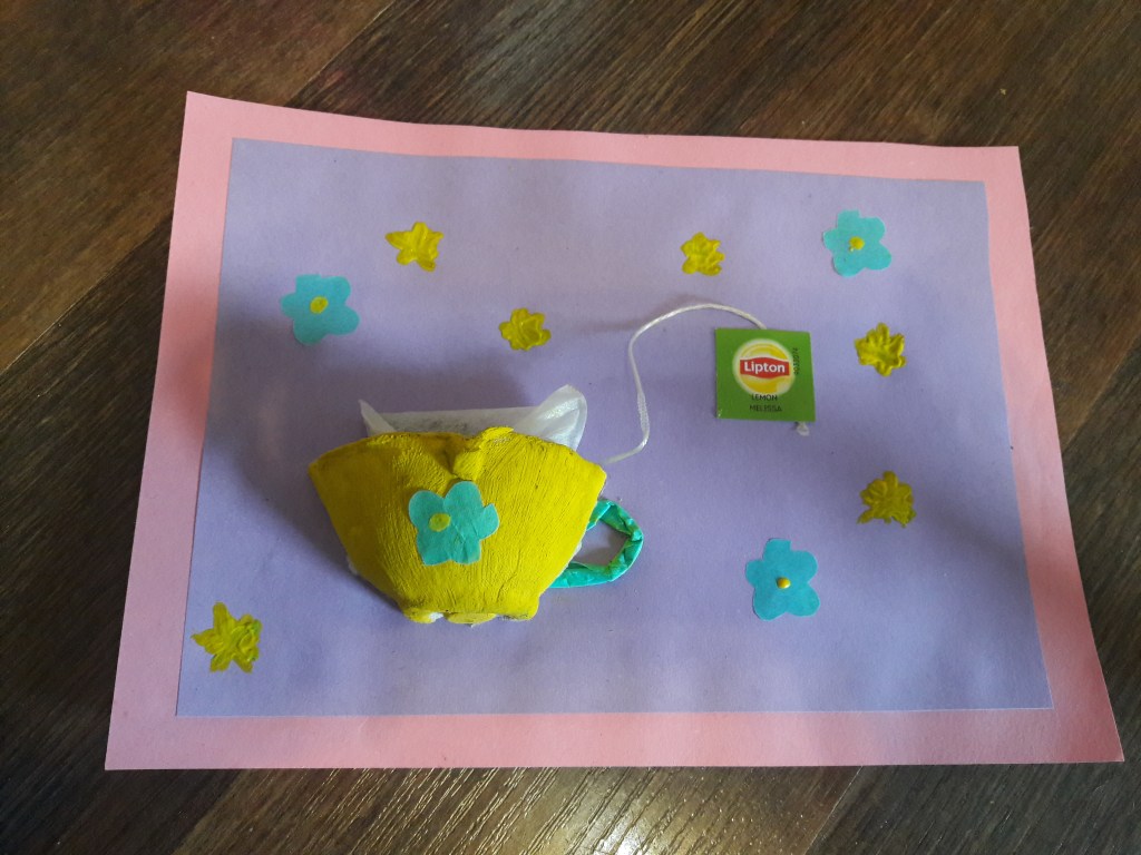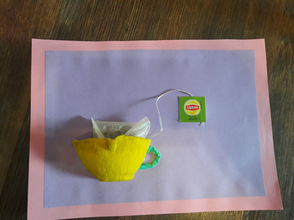 Przyklejamy filiżankę z wytłoczki. Wkładamy do filiżanki herbatę i przyklejamy obok etykietkę