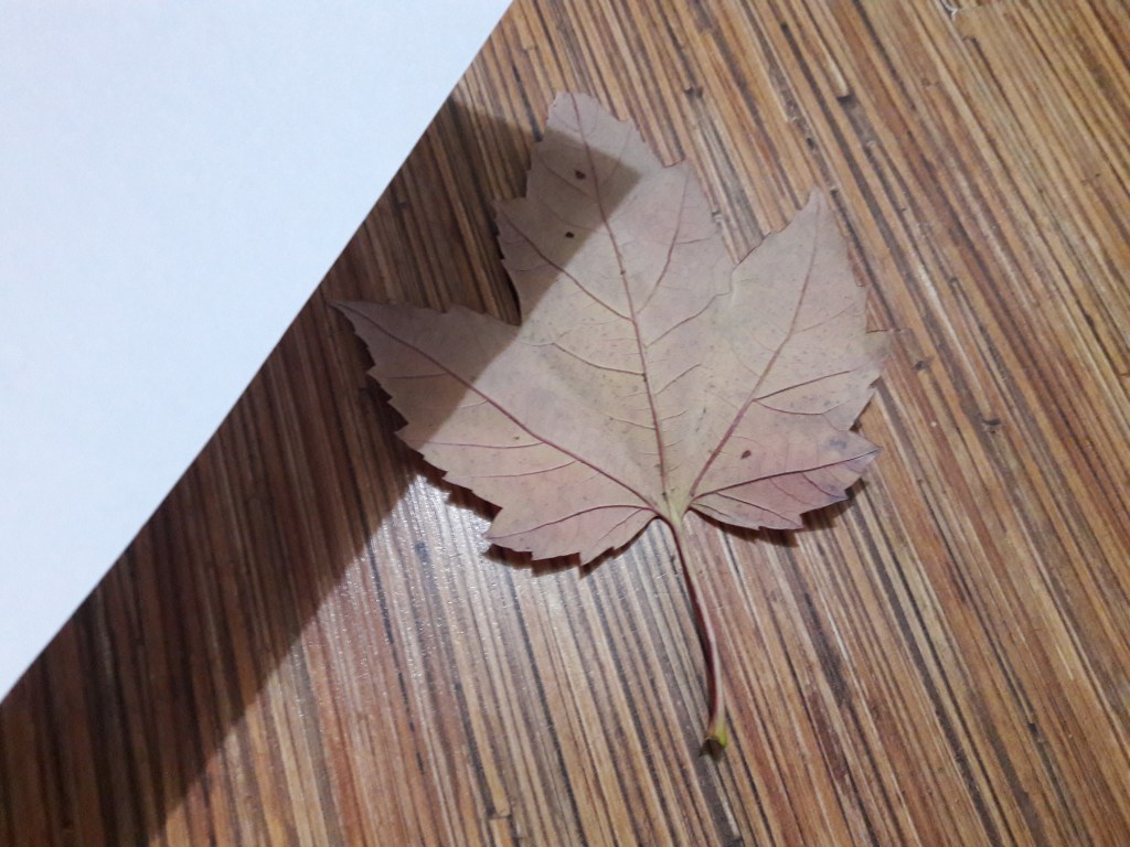 Liść kładziemy na stole (podłodze) w ten sposób aby na górze nalazła się jego tylna strona na której wyraźniejsze są żyłki, a bardziej kolorowa strona przylegała do stołu. Następnie nakrywamy liść kartką papieru
