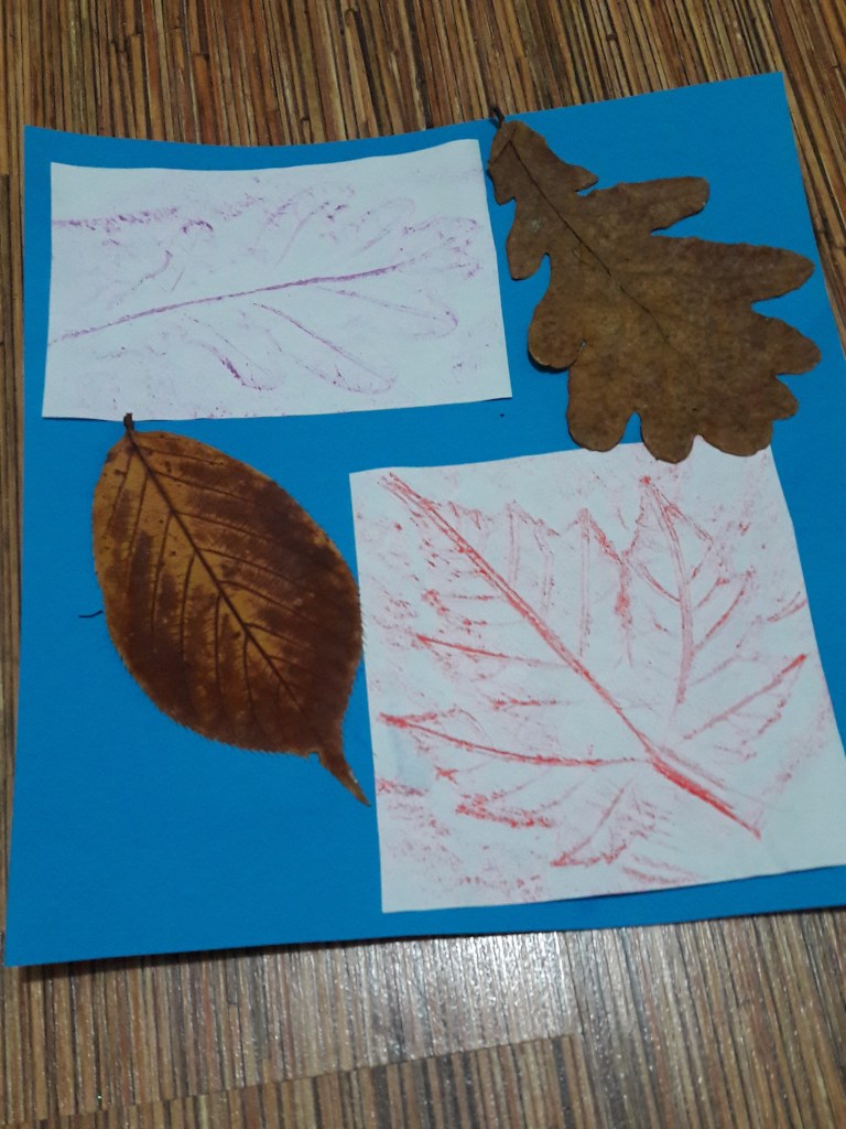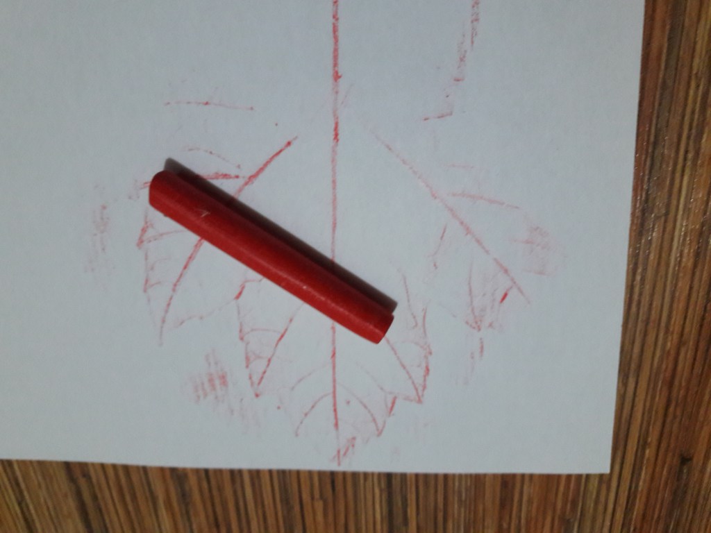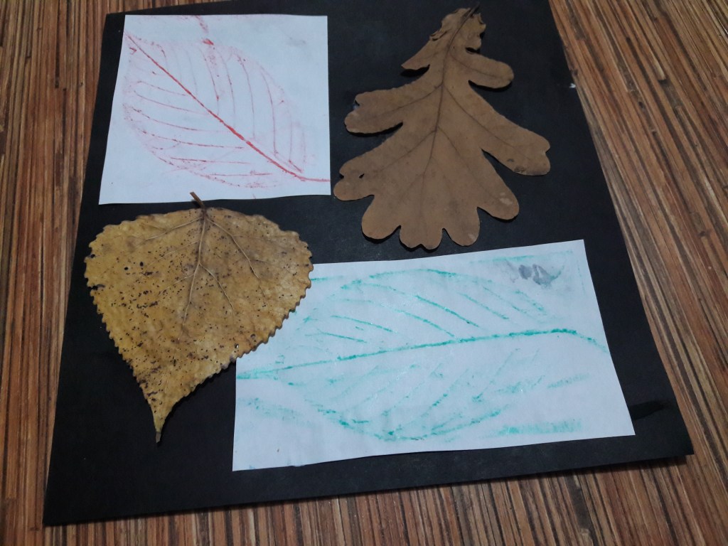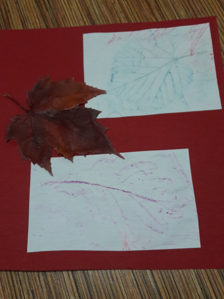 Kredkę kładziemy poziomo na kartce i przeciągamy nią po kartce i znajdującym się pod nią liściu. Nie przyciskamy zbyt mocno.