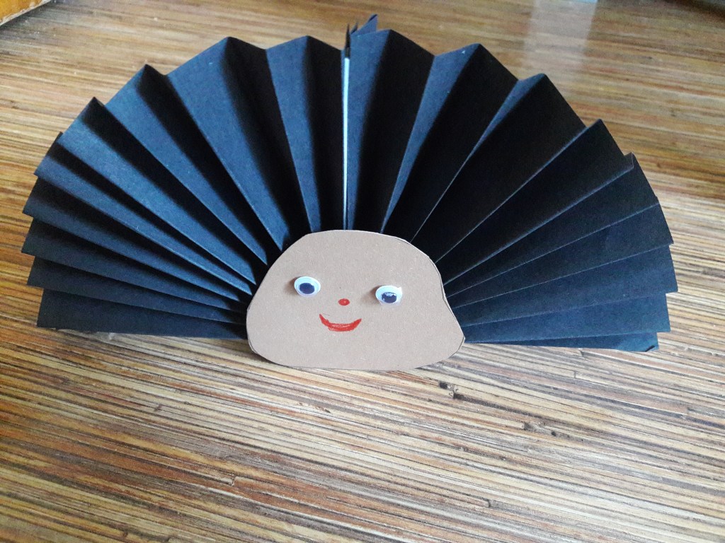 Ołówkiem rysujemy na grubszym papierze kształt jeża w dwóch takich samych kopiach, wycinamy nożyczkami, doklejamy lub dorysowujemy oczy, nosek i buzię.