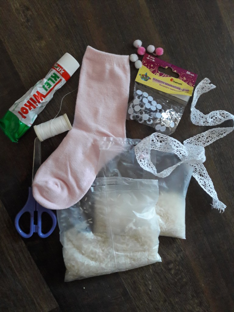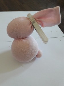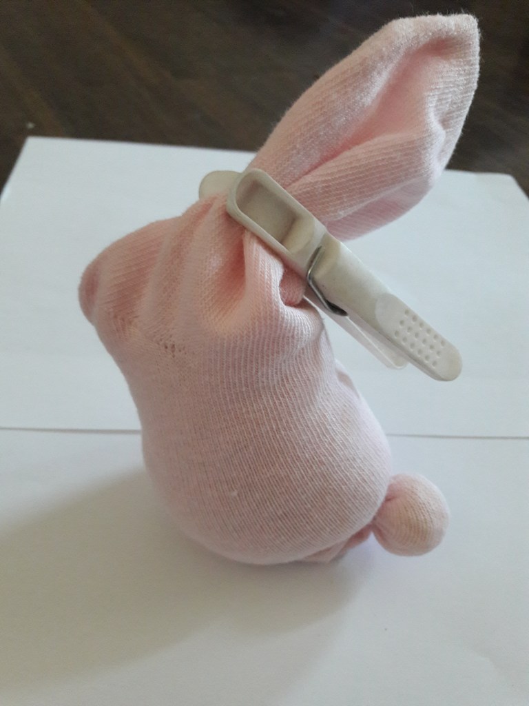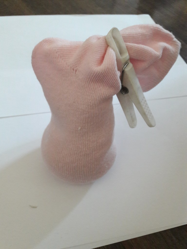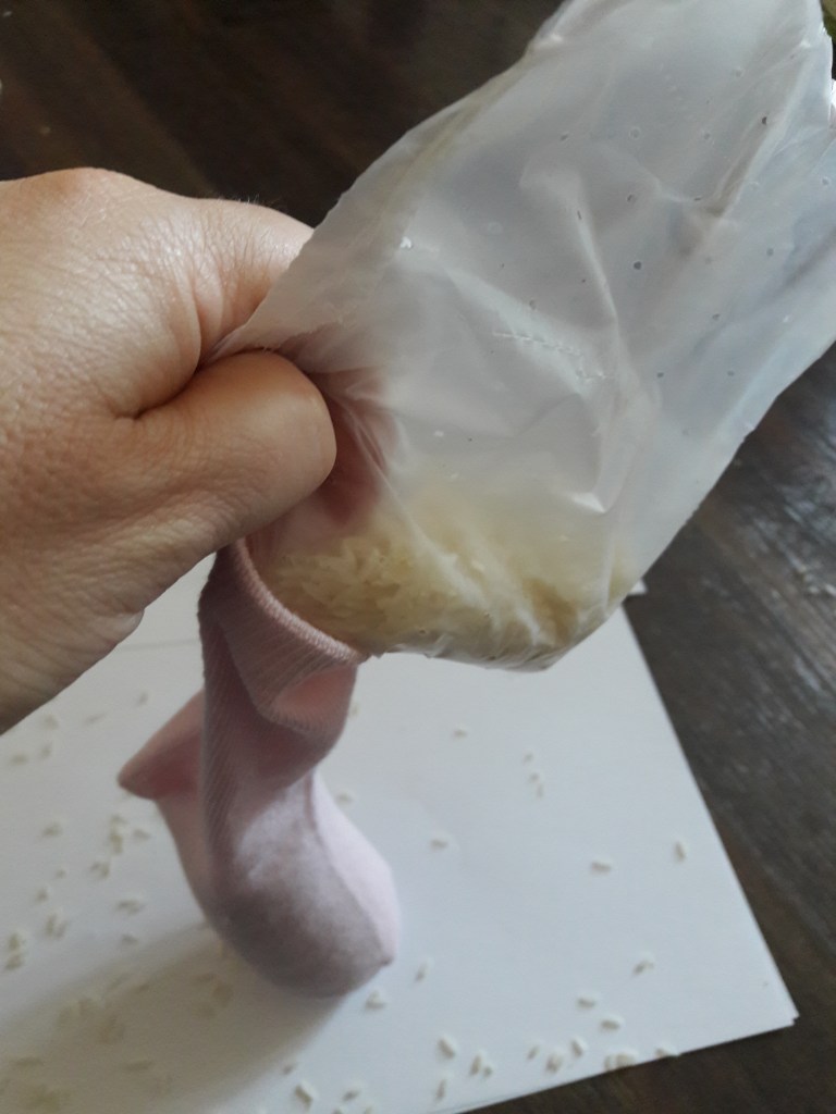 Do skarpety wsypujemy ryż tak aby wypełnić ją mniej więcej do wysokości pięty. Spinamy spinaczem, do bielizny aby ryż się nie wysypywał. Można zamiast niego użyć gumki, sznurka lub wstążeczki