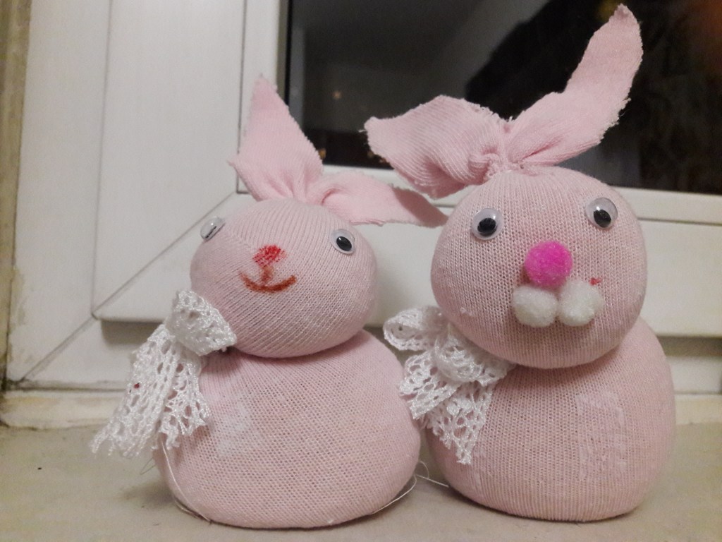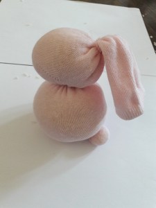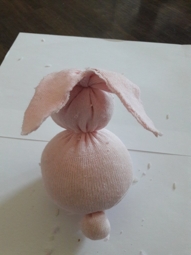Sklejamy razem górną i dolną warstwę każdego ucha. Przyklejamy oczy i nos. Można również narysować je pisakami. Nos powinien znaleźć się w miejscu piety skarpety. Na szyi gotowego królika zawiązujemy wstążeczkę.