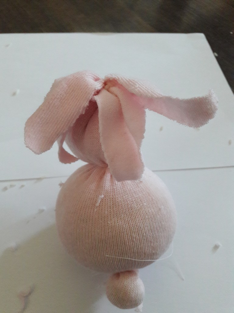 Dosypujemy trochę ryżu , formujemy tułów i głowę królika i rozdzielamy je nitką. Następnie oddzielamy głowę od górnej części z której będziemy robić uszy