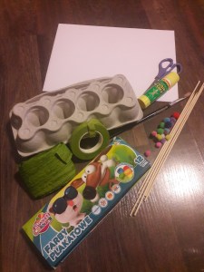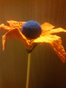Na wystający ostry koniec patyczka nabijamy nasmarowany klejem pompon i mocno zaciskamy aby kwiatek został unieruchomiony pomiędzy pomponem a plasteliną. To najtrudniejsza część, więc nie przejmujemy się jeśli za pierwszym razem nie chce się trzymać. Można poprosić kogoś o pomoc. Jeśli nie mamy pomponów można posłużyć się kulką z bibuły, plasteliny lub modeliny
