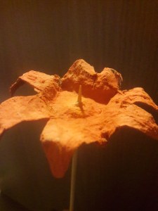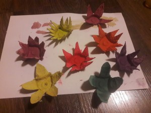 Malujemy kwiatki farbami na różne kolory z obu stron. Czekamy aż wyschną (ok. 1 godzina). Najlepiej użyć farb plakatowych rozrabianych wodą, które szybciej schną i można malować z obu stron za jednym razem. Farby. Które nie potrzebują wody schną wolniej i najlepiej malować jedną stronę już po wyschnięciu drugiej, bo inaczej może się przyklejać do kartki lub stołu. Uważamy aby warstwa farby nie była za gruba. To wydłuża wysychanie. Po wyschnięciu wyginamy płatki kwiatków na zewnątrz