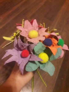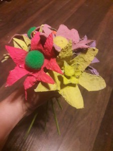Bukiecik gotowy. Jeśli komuś nie udało się zrobić łodyżek, to można również same główki kwiatków przykleić na kolorowej kartce i dorysować wazon lub piękną wiosenną łąkę