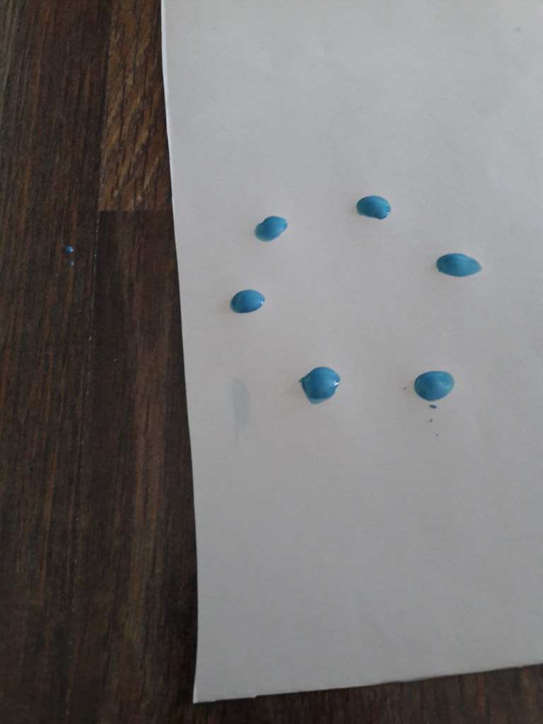Nabieramy farbę na pędzelek i robimy na papierze kilka wypukłych kropek, które tworzą mniej więcej kształt okręgu. Rozmazujemy każdą kropkę jednym ruchem palca w kierunku środka okręgu.
