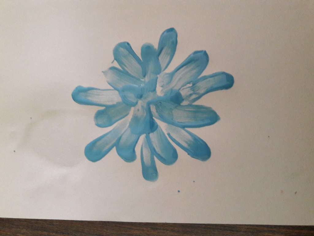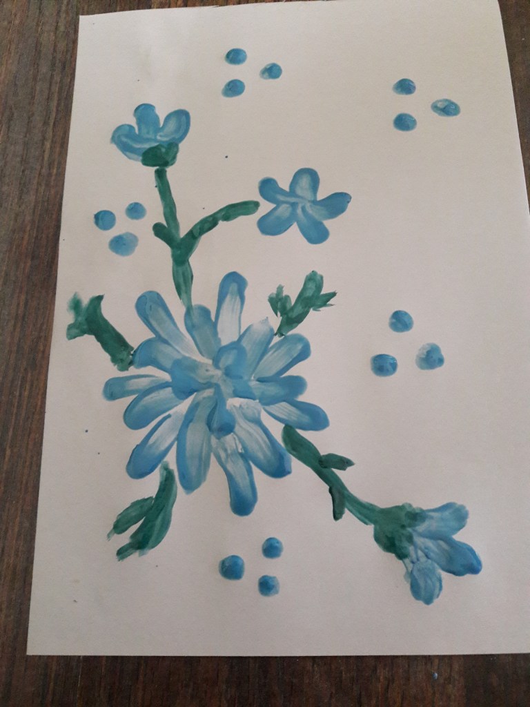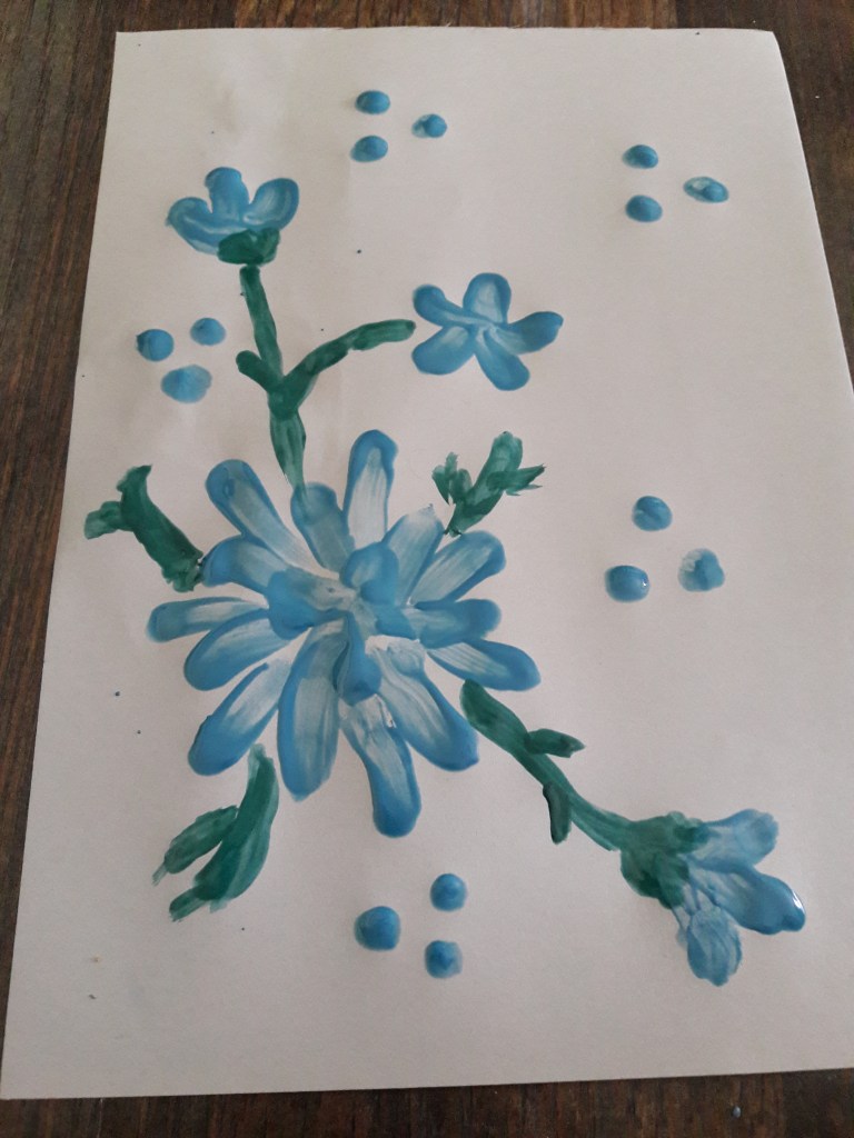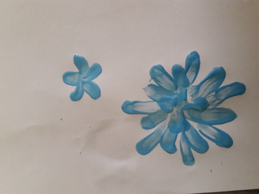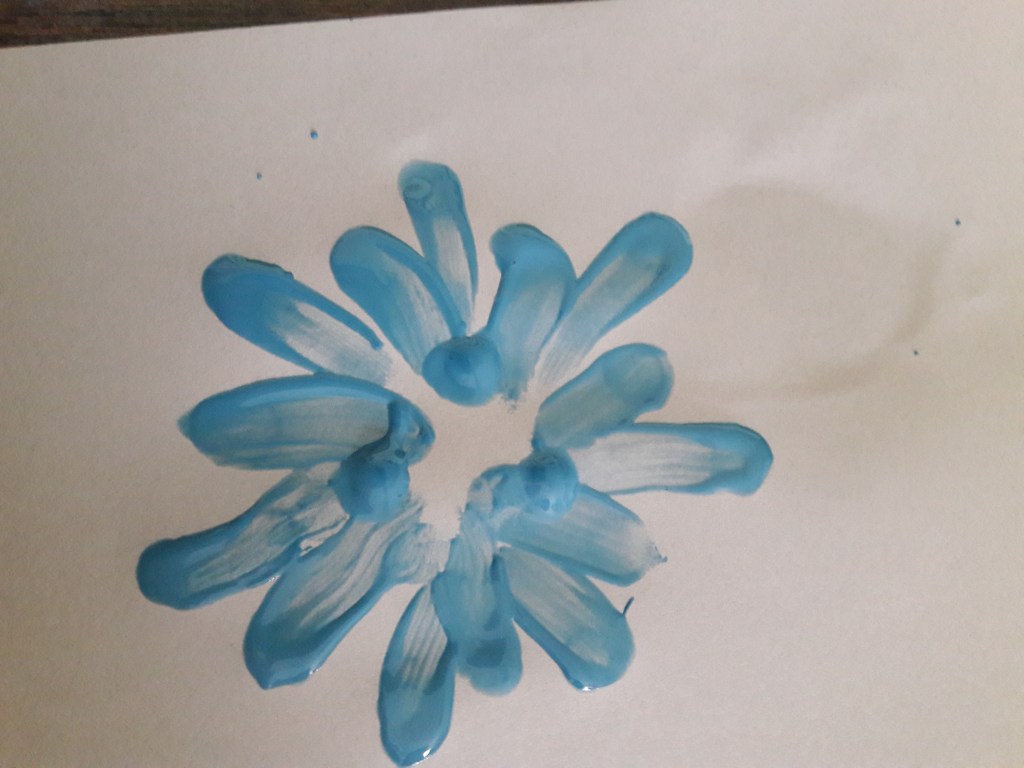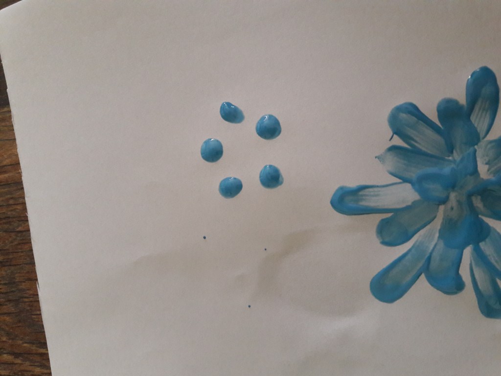 Obok dużego kwiatka możemy namalować mniejszy. Robimy 5 kropek układających się w kształt małego kółeczka i rozmazujemy je