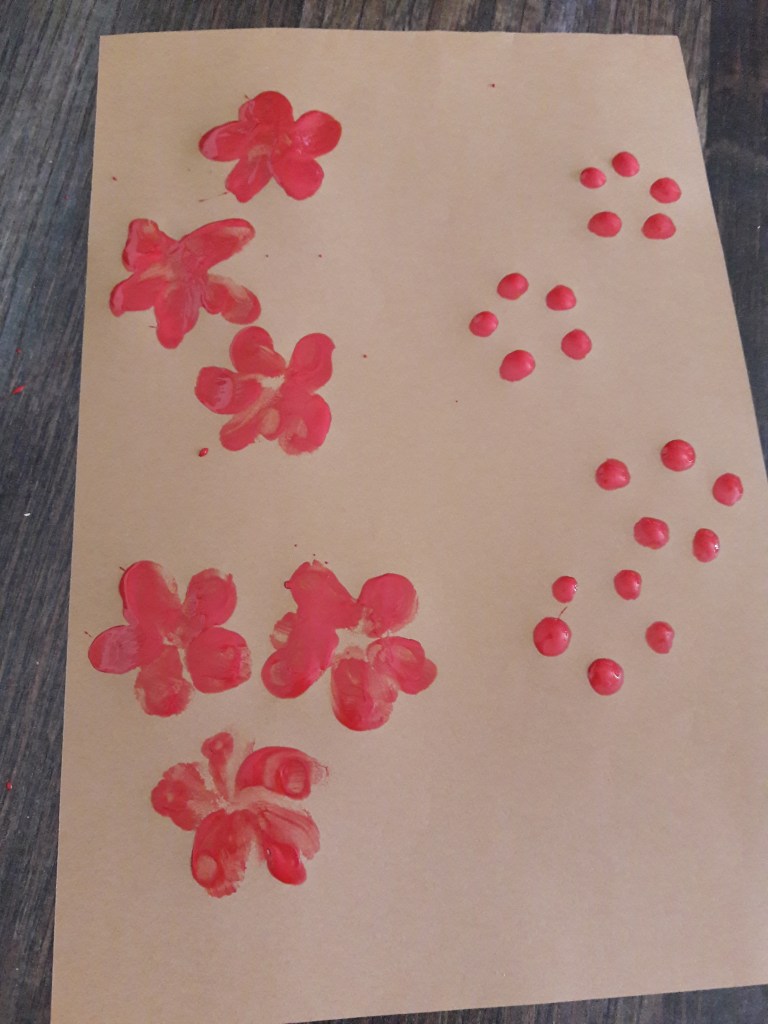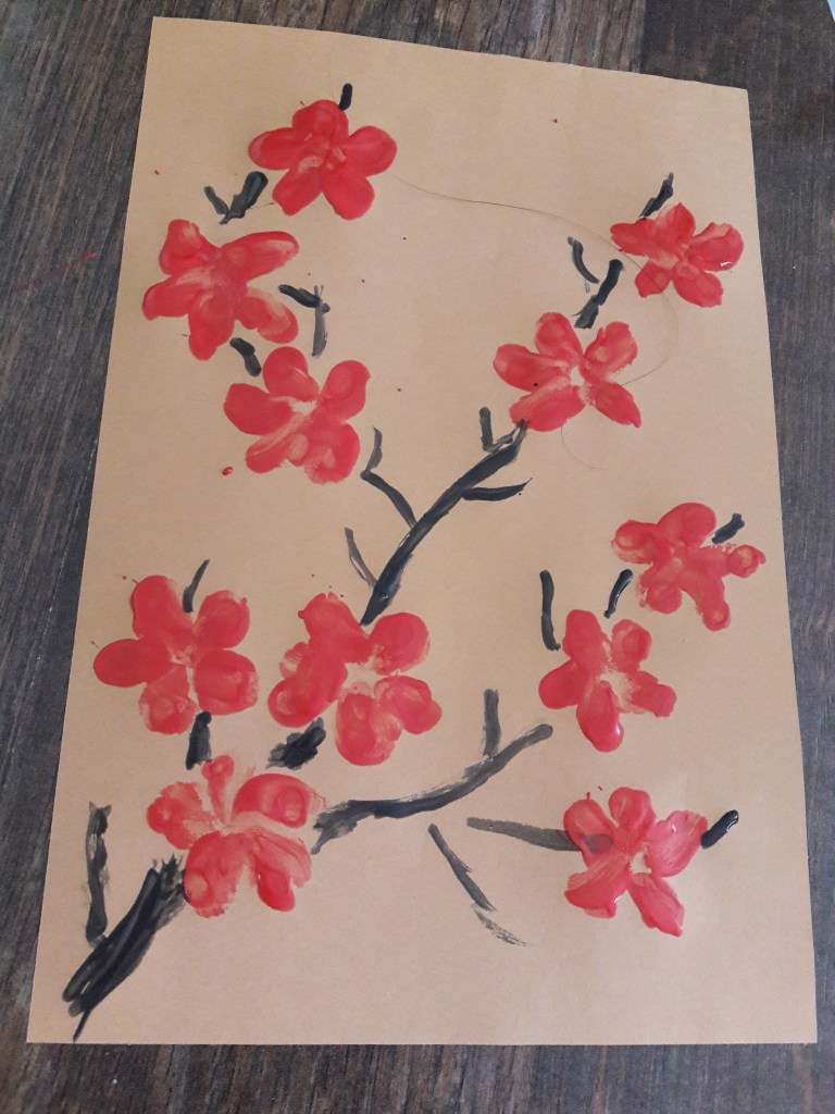 Namalowanie kwitnącej gałązki jest jeszcze łatwiejsze. Dobrze jest na początku zaplanować w których miejscach znajdą się kwiatki. Rozmazując kropki staramy się aby środki kwiatków pozostały puste. Na koniec całość łączymy gałązką.