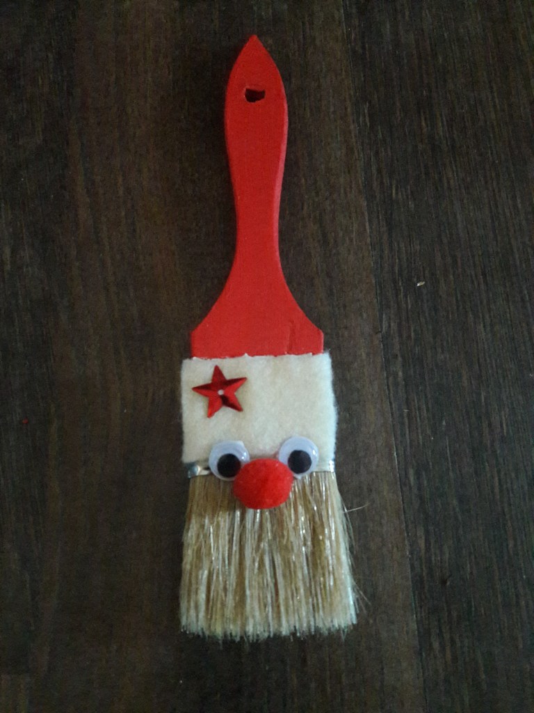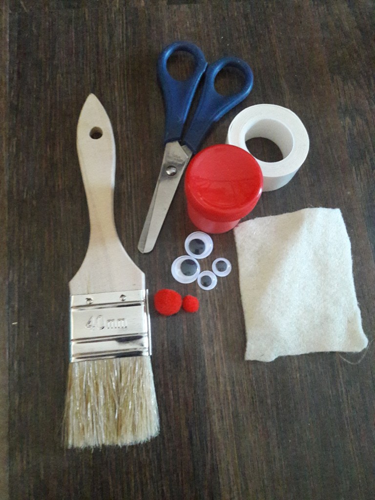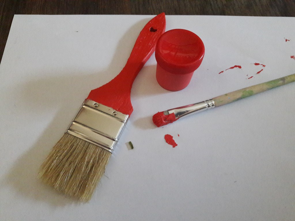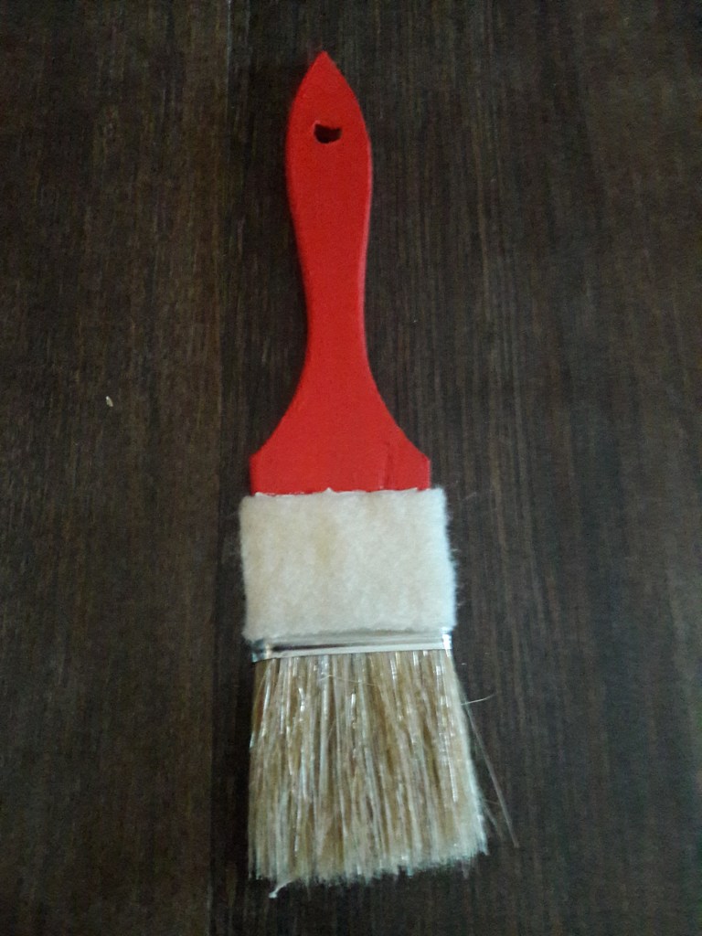 Malujemy pędzel czerwoną farbą po obu stronach. Czekamy aż wyschnie. Z filcu lub płatka kosmetycznego wycinamy prostokąt i naklejamy go na pędzelku przy pomocy taśmy