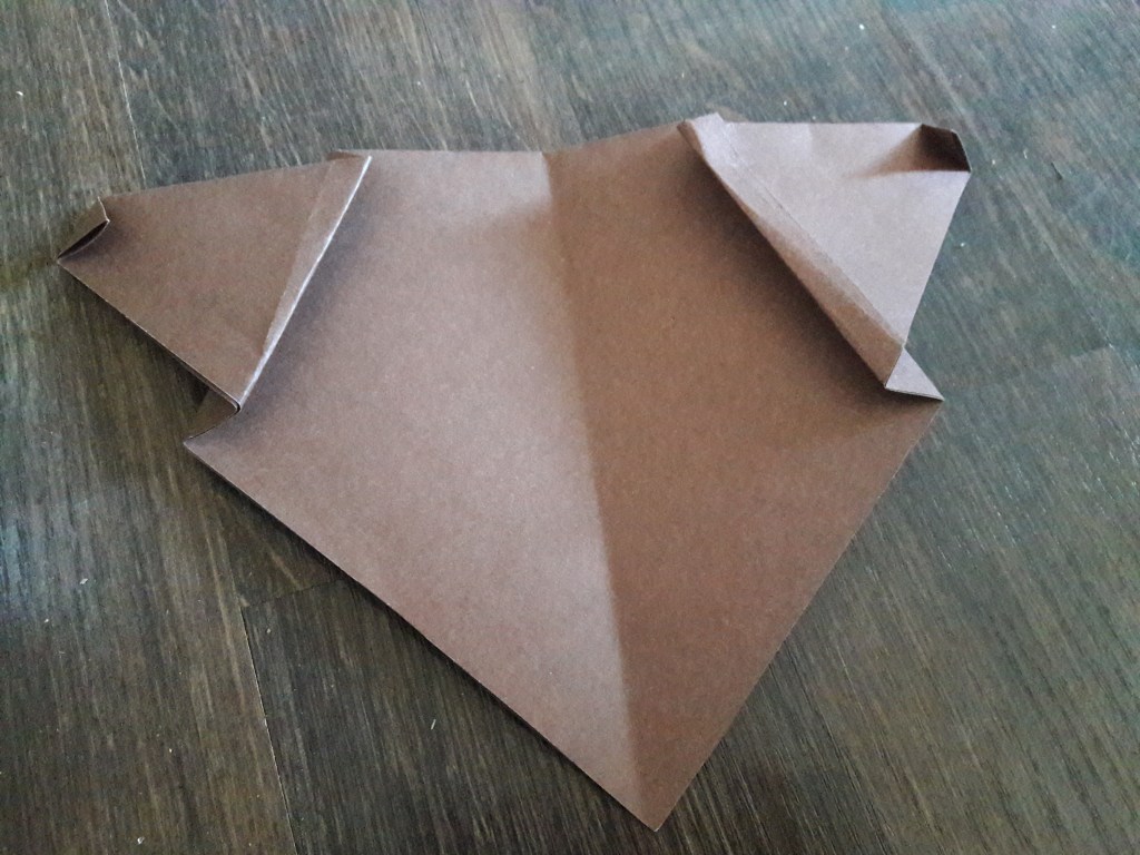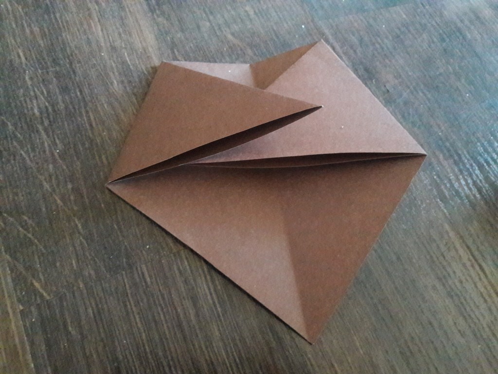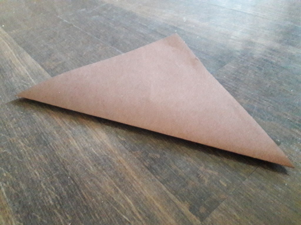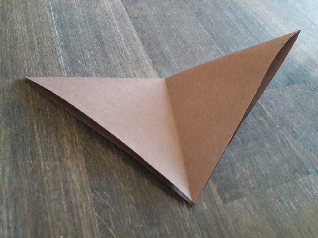 Kwadrat z brązowego papieru składamy na pół. Następnie jeszcze raz składamy na pół i rozkładamy