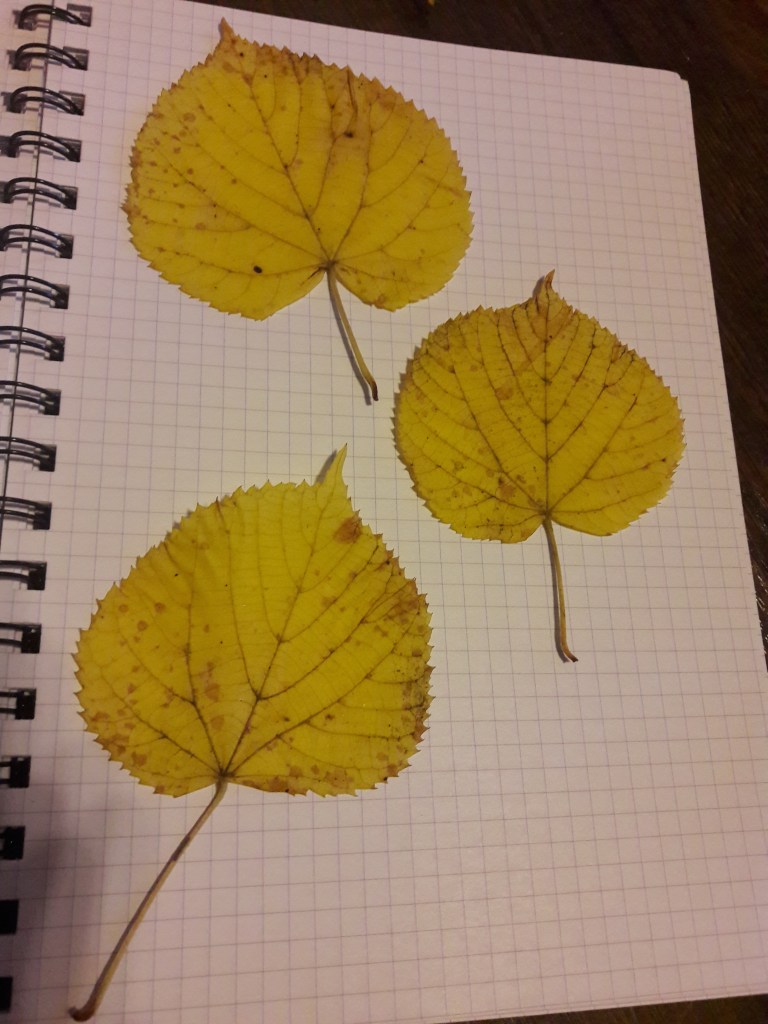 Zebrane liście suszymy przynajmniej przez kilka godzin pomiędzy kartkami zeszytu aby nie były pomięte i pozwijane.