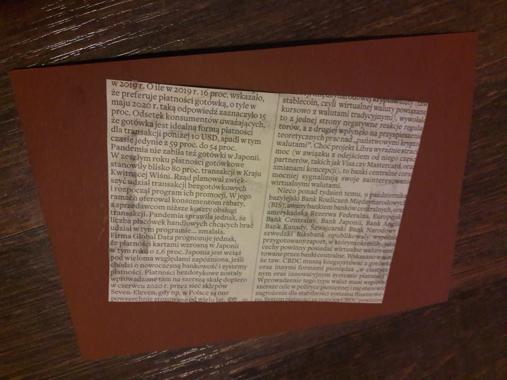 Z gazety wycinamy prostokąt i przyklejamy go na kolorowej kartce. Wybieramy taki fragment strony aby nie było na nim zdjęć ani dużych nagłówków. Na gazecie przyklejamy liść