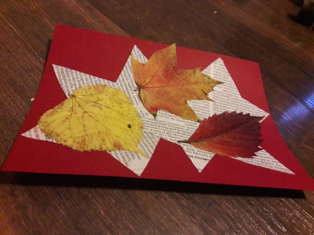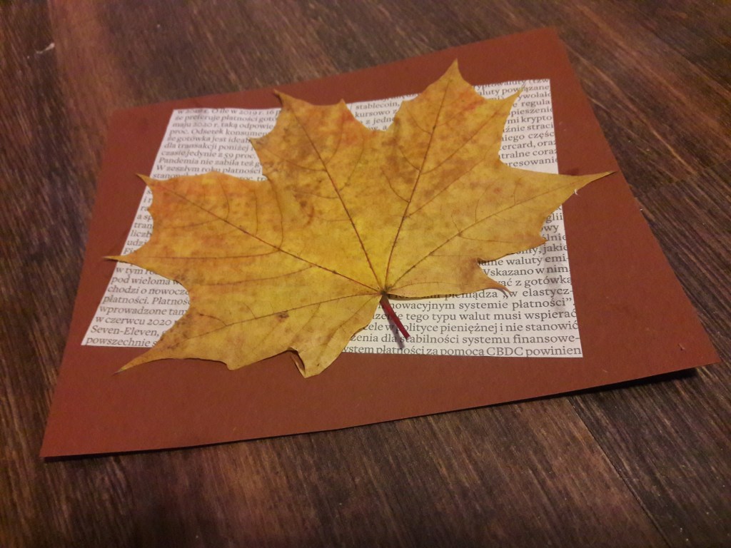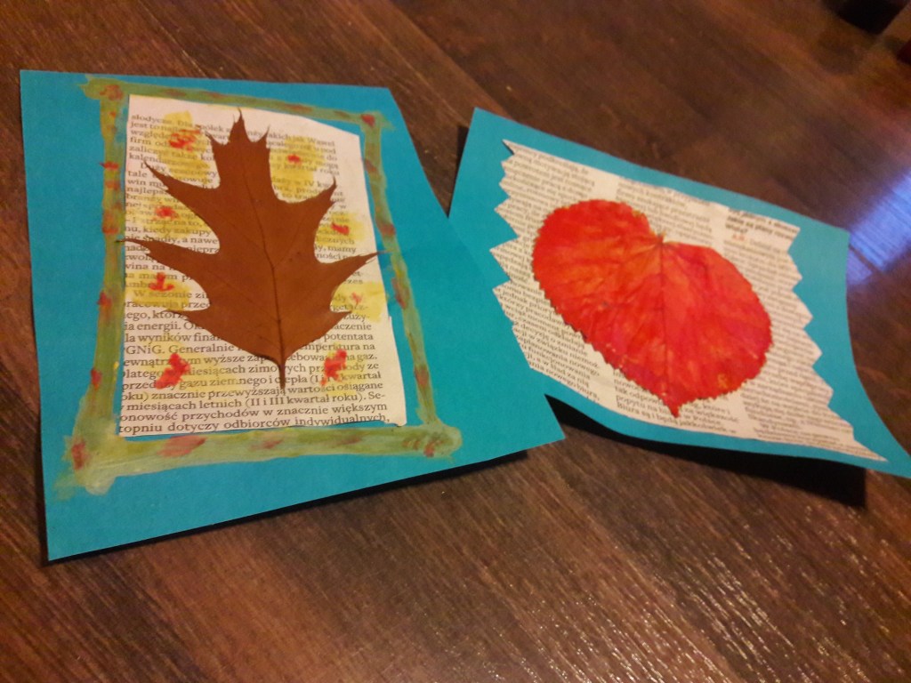 W bardziej skomplikowanej wersji można na przykład wyciąć z gazety gwiazdki, serduszka lub nieregularne kształty. Można domalować farbami dodatkowe elementy albo pomalować liść. (wtedy z jego przyklejeniem oczywiście czekamy aż wyschnie).