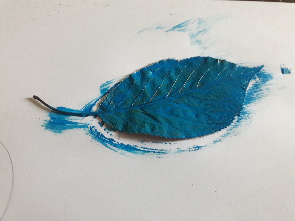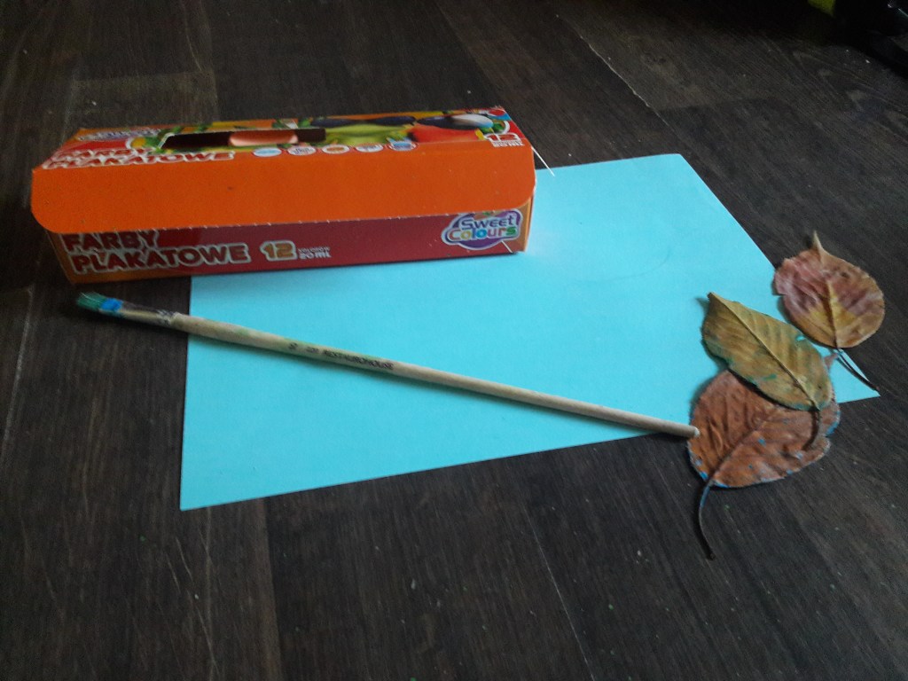 Malujemy liście gęstą farbą, najlepiej zupełnie bez dodatku wody koniecznie po tej stronie gdzie żyłki są wyraźniejsze.