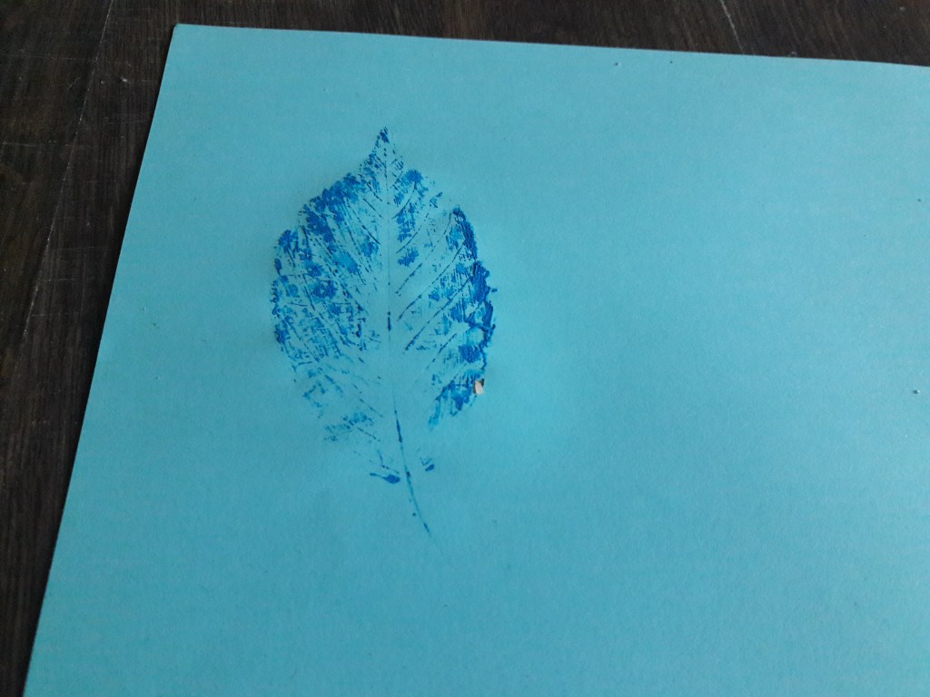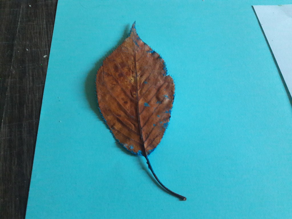 Przykładamy liść pomalowaną stroną do kartki, przykrywamy drugą kartką i mocno odciskamy
