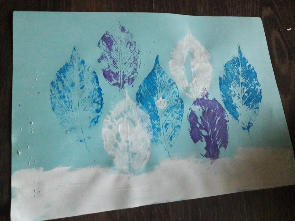 Odciskamy kolejne liście. Można tez użyć kilkakrotnie tego samego liścia za każdym razem na nowo go malując. Na koniec pędzelkiem domalowujemy pozostałe elementy obrazka.