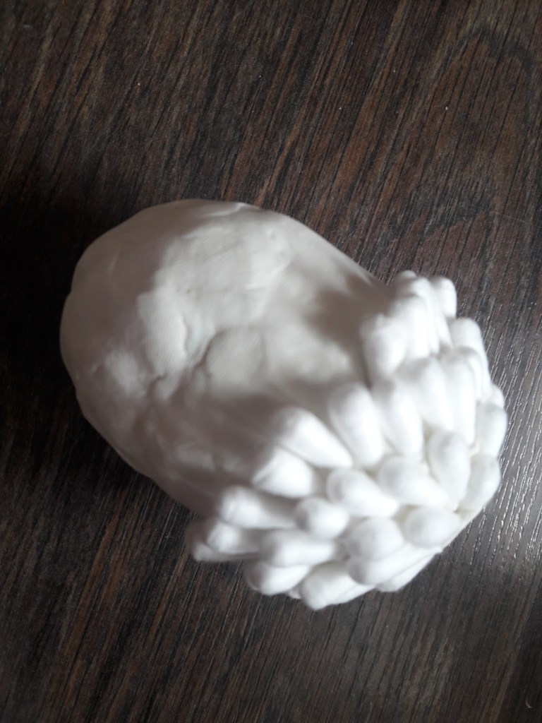 Obcinamy nożyczkami końcówki półeczek kosmetycznych. Jajko oklejamy plasteliną (nie za grubo i nie za cienko)
