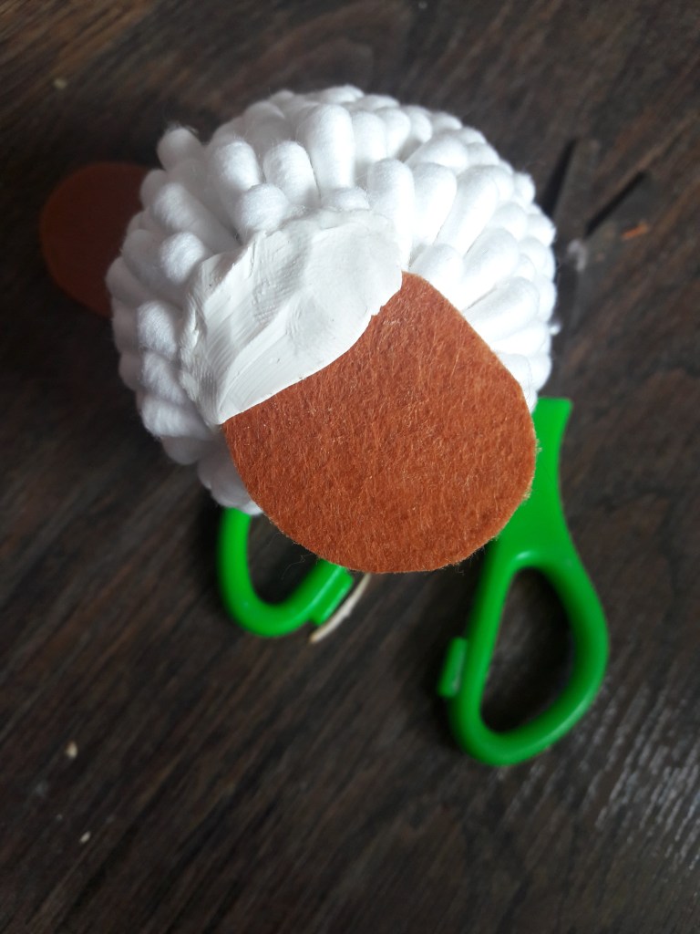 Z filcu lub tektury wycinamy głowę owieczki i przyklejamy lub przypinamy szpilką do jajka. Na wierzchu naklejamy trochę plasteliny do której przyklejamy dwie końcówki pałeczek na nieco dłuższych kawałkach rurek jako uszy oraz kilka krótkich końcówek jako grzywkę. Doklejamy oczy.