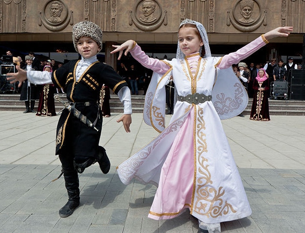 Ale Rosja to także baśniowy Kaukaz. Te piękne dziewczyny płynące nad ziemią w długich sukniach i welonach… Ci chłopcy z kindżałami u pasa (kindżał to taki zakrzywiony sztylet) wyczyniający cyrkowe akrobacje w bardzo szybkim rytmie wybijanym na małych bębenkach…Piękne górskie krajobrazy i bohaterskie opowieści