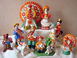 Z kolei w okolicach wsi Dymkovo od wieków wykonuje się kolorowe gliniane zabawki przedstawiające ludzi i zwierzęta/