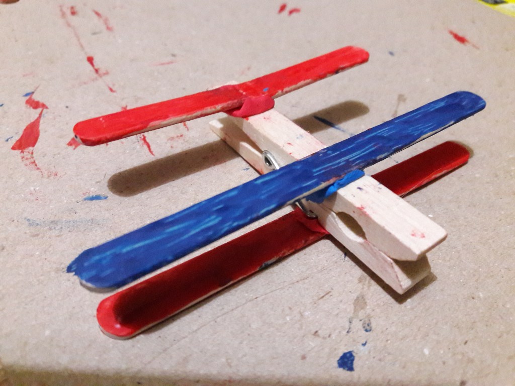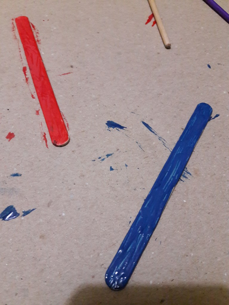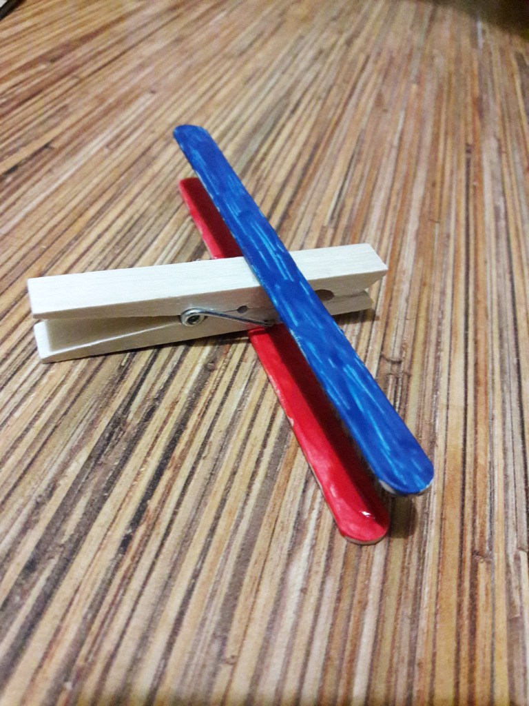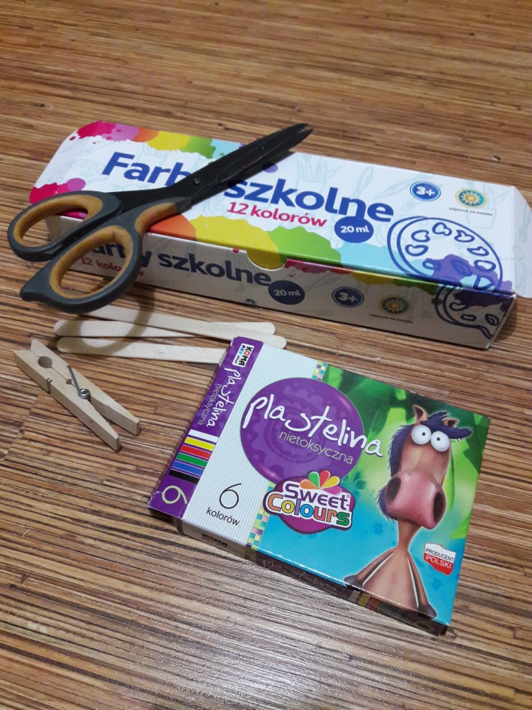 Patyczki po lodach malujemy farbami z obu stron. Za pomocą plasteliny przyklejamy dwa patyczki do spinacza w miejscach gdzie wystaje z niego drut