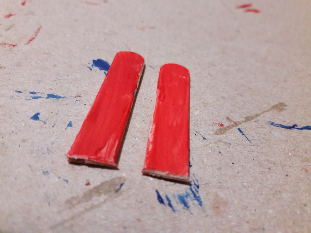 Kolejny patyczek łamiemy na pół i nożyczkami przycinamy aby otrzymać dwie równe ale trochę krótsze połówki. Obie połówki przyklejamy w pobliżu drugiego końca spinacza tak aby utworzyły całość.