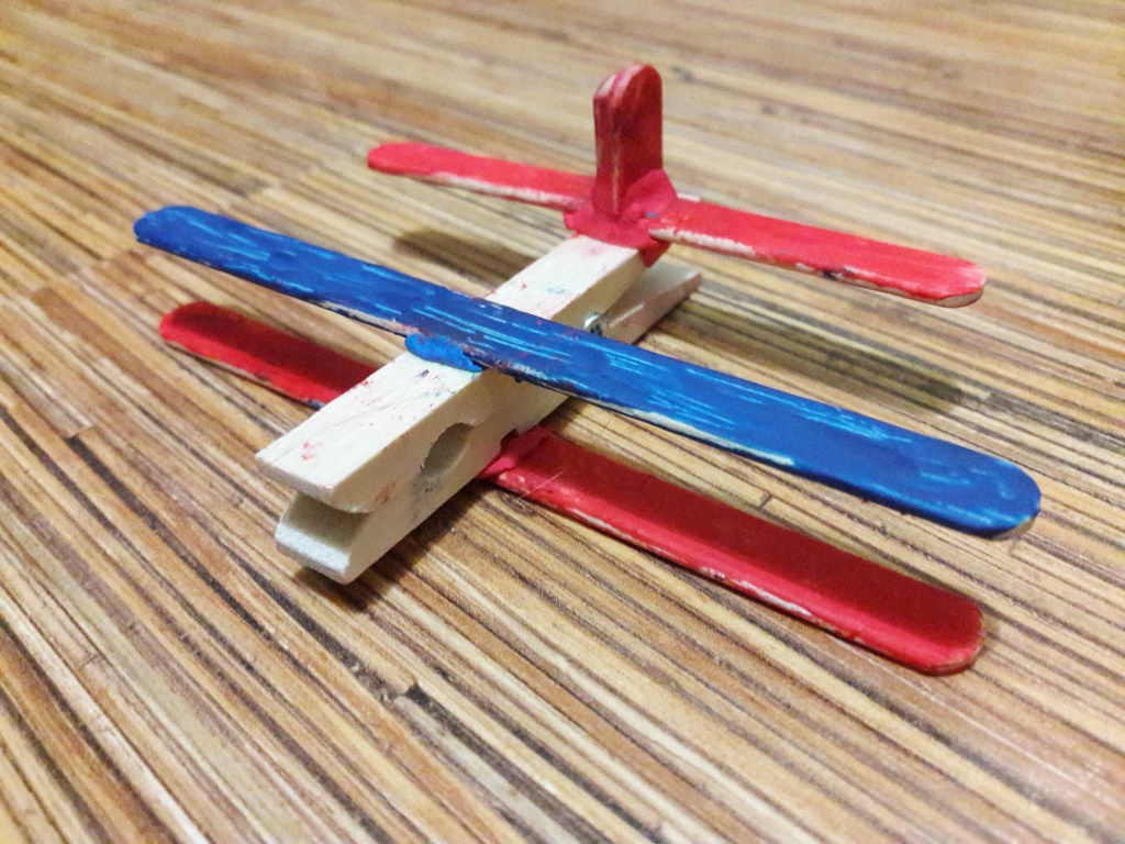 Od kolejnego patyczka ucinamy tylko dwa równe końce. Sklejamy je ze sobą plasteliną lub klejem a następnie przyklejamy pionowo w miejscu połączenia poprzednich polówek tworząc ster samolotu.