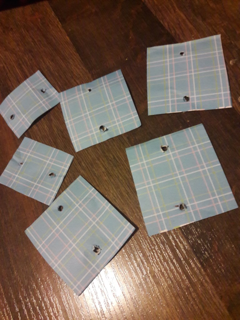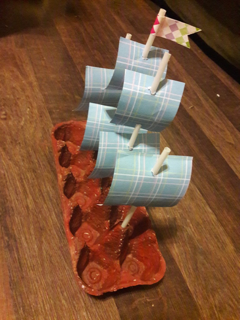 Wytłaczankę malujemy farbami i zostawiamy do wyschnięcia. Wkładamy rurki, przycinamy na odpowiednią długość – dwie zewnętrzne powinny być krótsze, wewnętrzne dłuższe. Od spodu podklejamy każdą rurkę plasteliną. Z kolorowego papieru wycinamy 4 większe i 2 mniejsze kwadraty. Nożyczkami robimy w nich dziurki. Nie za duże, aby żagle nie spadały z masztów.