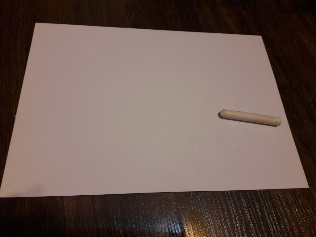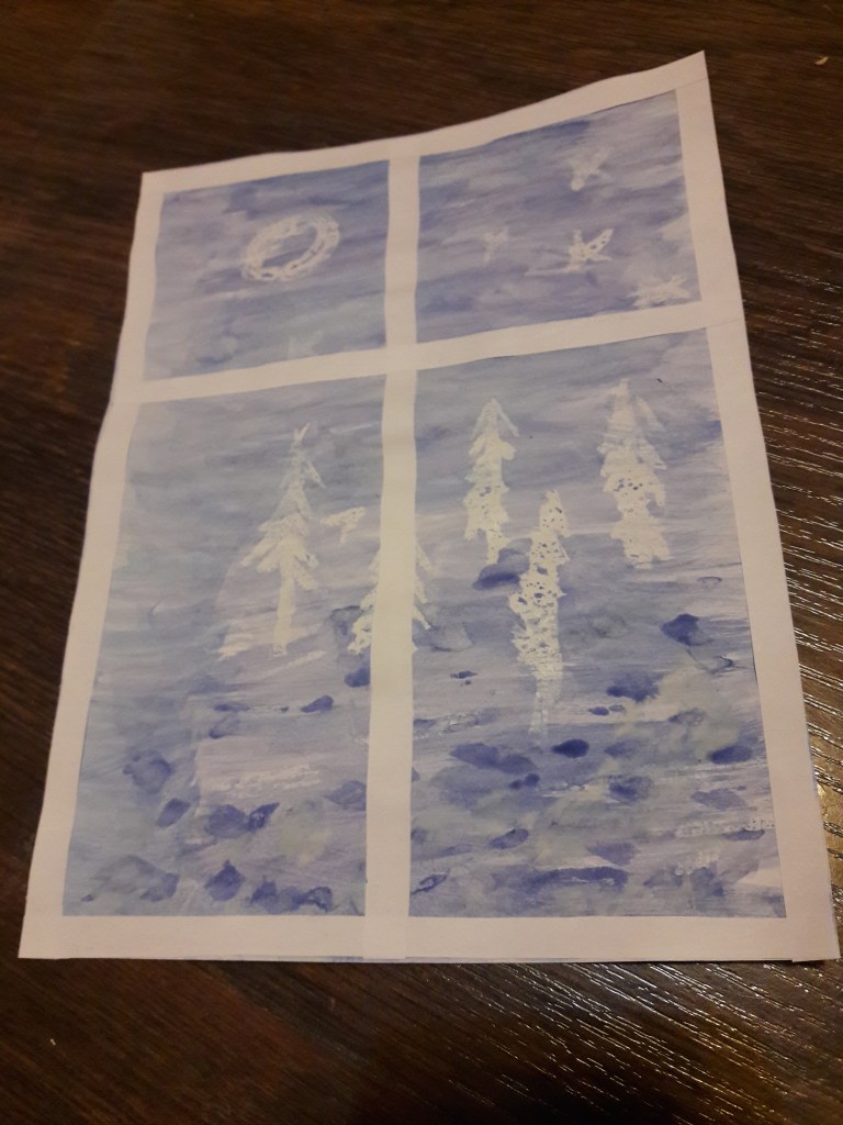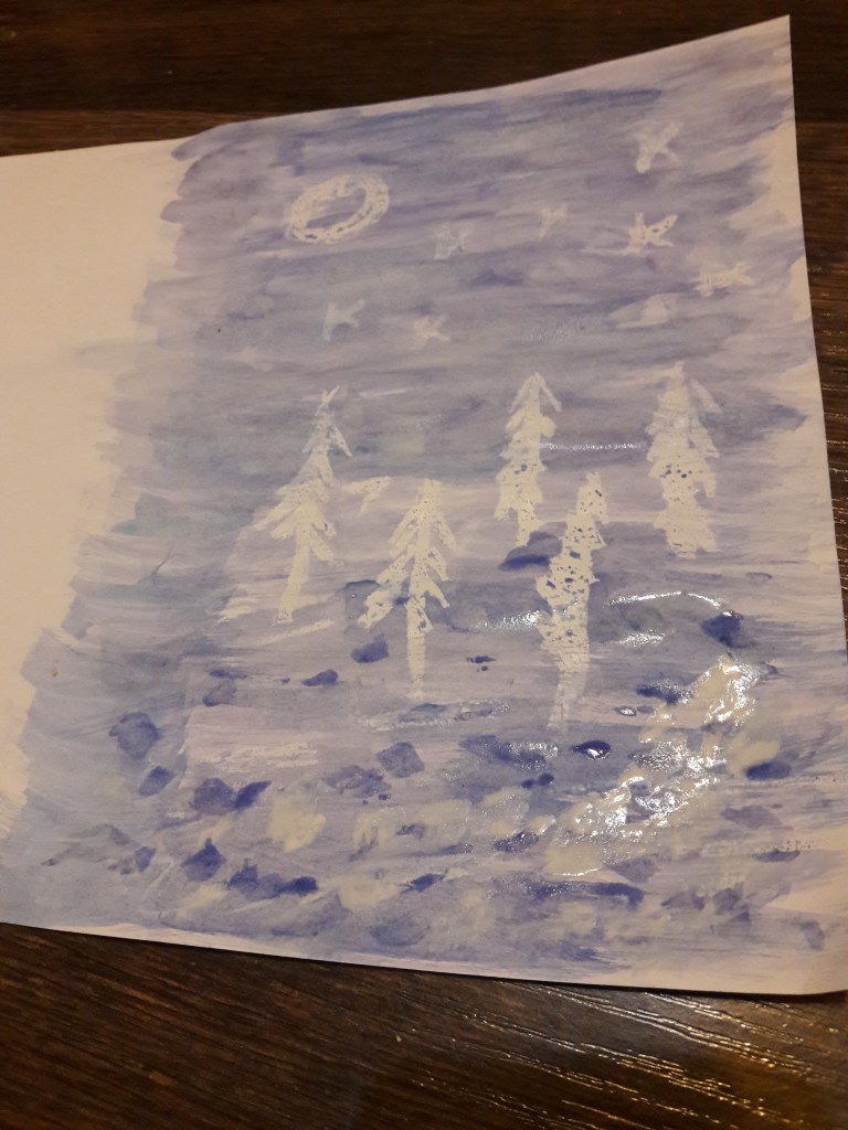 Biała kredką rysujemy na połowie kartki zimowy krajobraz mocno przyciskając kredkę. Na tym etapie biały rysunek na białej kartce nie jest widoczny.