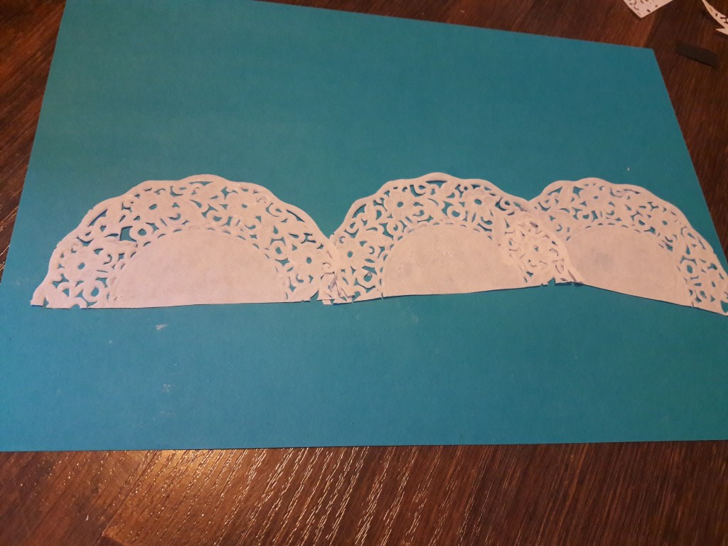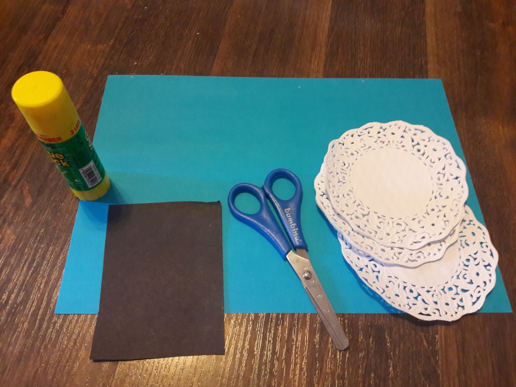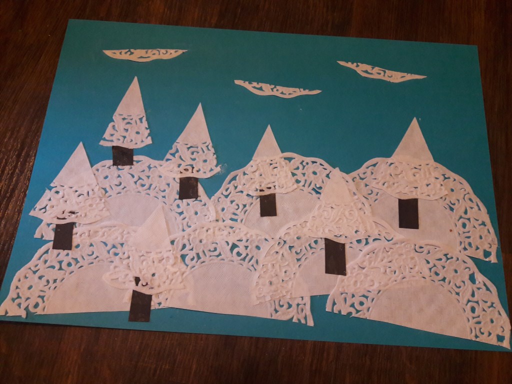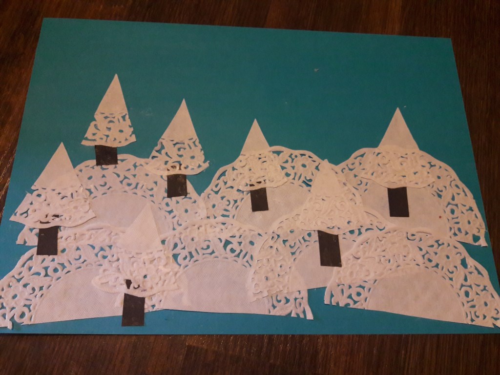 Jedną lub dwie serwetki rozcinamy na trójkąty. Z czarnego papieru wycinamy prostokątne pnie drzew. Układamy drzewa na obrazku i przyklejamy je zaczynając od pni. Na koniec doklejamy chmurki wycięte z brzegów serwetek.