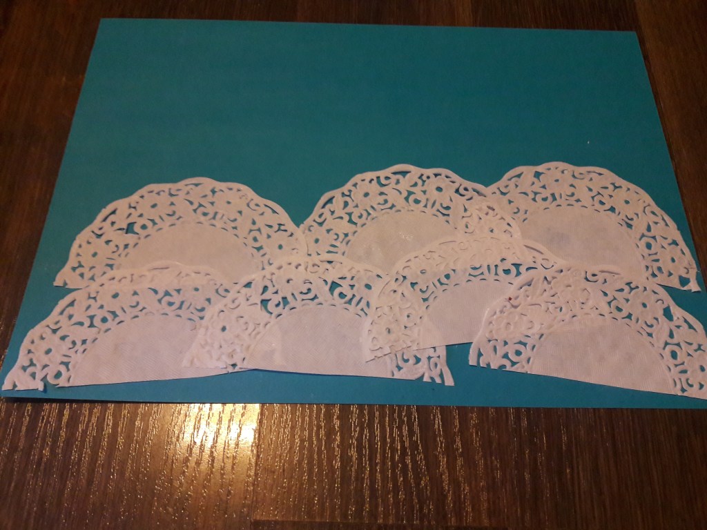Kilka serwetek przecinamy na połowę. Układamy z nich dolną część obrazka. Przyklejamy zaczynając od tych, które mają być wyżej.